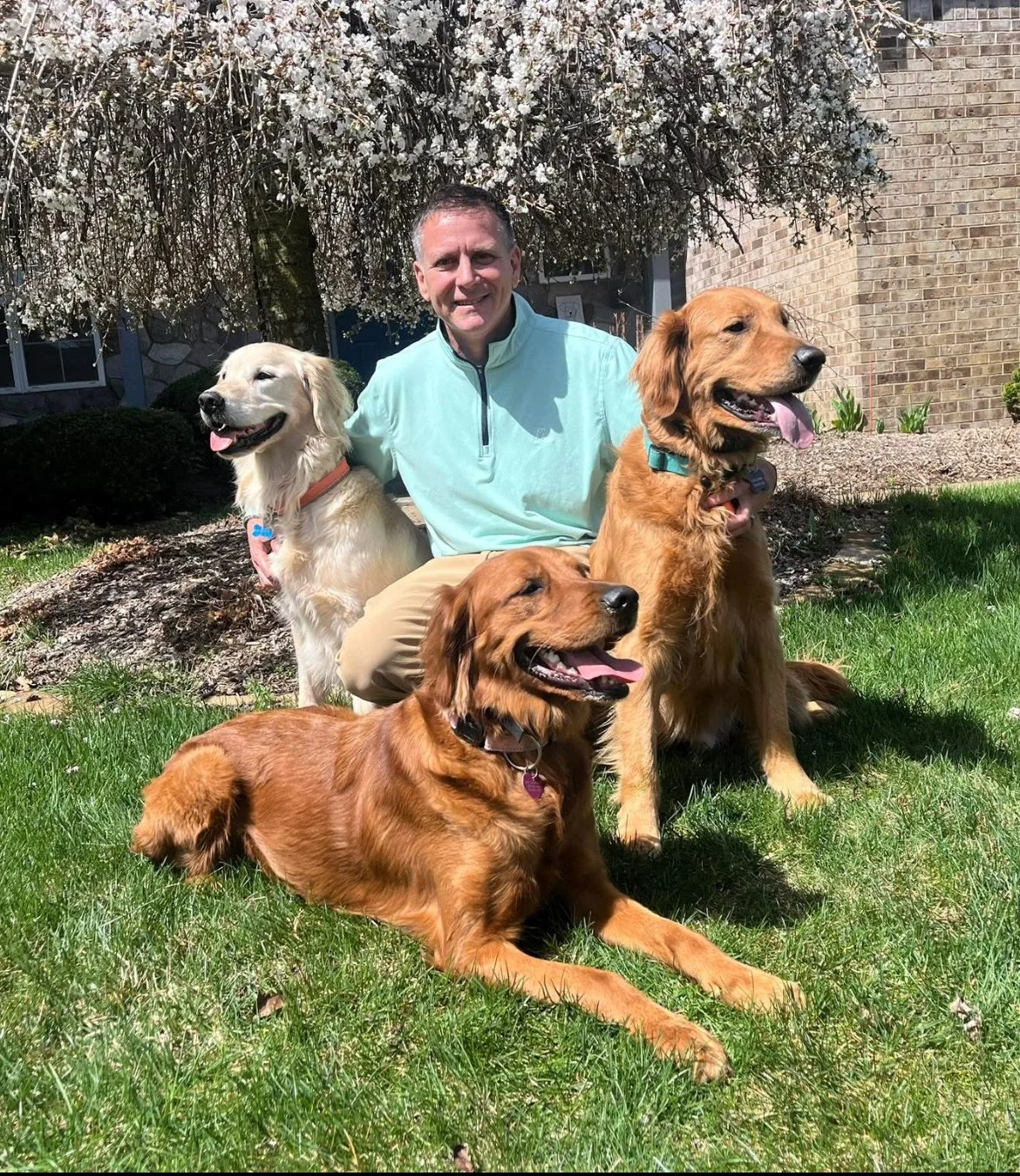I’m Jeff Grabowski, a lifelong Michigan resident raised in the company of Golden Retrievers, thanks to my parents and uncle who always had one in their homes. Once my career stabilized, my wife Vickie and I began raising Goldens ourselves, starting with one and eventually welcoming three into our family. My journey with Golden Retriever Rescue of Michigan (GRRoM) started in 2023 when we fostered Cali, a 9-month-old female and my first GRRoM rescue. That experience ignited a passion, leading Vickie and me to get involved in fundraisers, transports, and GRRoM’s public events.